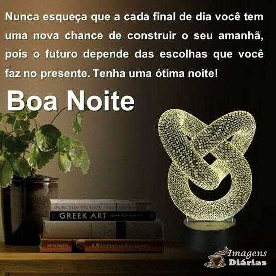 Nunca esqueça que a cada final de dia você tem uma nova chance de construir o seu amanhã, pois o futuro depende das escolhas que você faz o presente. Tenha uma ótima noite!