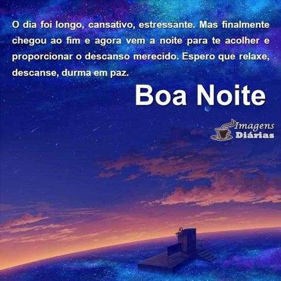 O dia foi longo, cansativo, estressante. Mas finalmente chegou ao fim e agora vem a noite para te acolher e proporcionar o descanso merecido. Espero que relaxe, descanse, durma em paz.