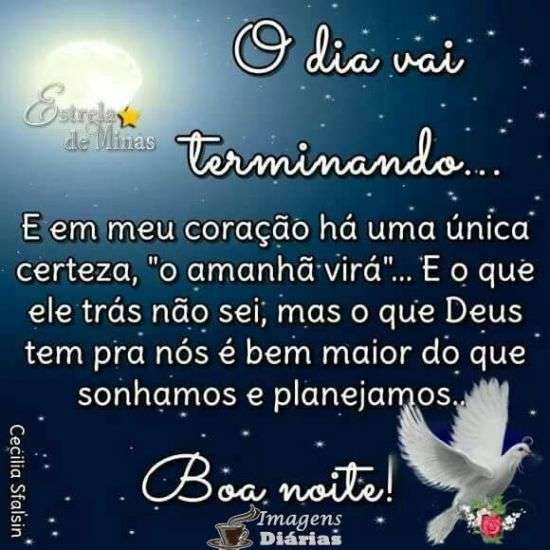 O dia vai terminando... E em meu coração há uma única certeza, "o amanhã virá"... E o que ele trás não sei, mas o que Deus tem pra nós é bem maior do que sonhamos e planejamos..