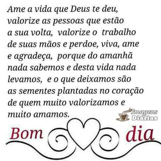 Ame a vida que Deus te deu, valorize as pessoas que estão a sua volta, valorize o trabalho de suas mãos e perdoe, viva, ame e agradeça, porque do amanhã nada sabemos e desta vida nada levamos, e o que deixamos são as sementes plantadas no coração de quem muito valorizamos e muito amamos.