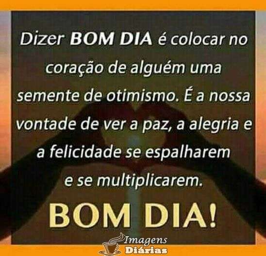 Dizer bom dia é colocar no coração de alguém uma semente de otimismo. É a nossa vontade de ver a paz, a alegria e a felicidade se espalharem e se multiplicarem.
