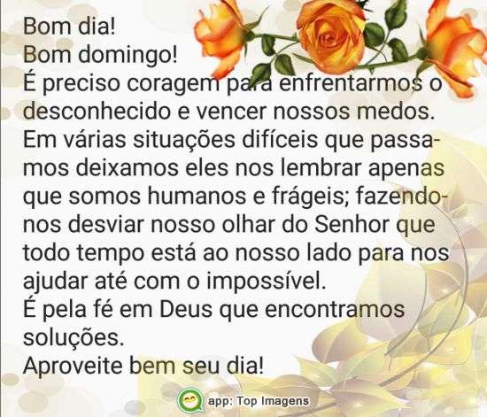 É preciso coragem para enfrentarmos o desconhecido e vencer nossos medos. Em várias situações difíceis que passamos deixamos eles nos lembrar apenas que somos humanos e frágeis; fazendo nos desviar nosso olhar do Senhor que todo tempo está ao nosso lado para nos ajudar até com o impossível. É pela fé em Deus que encontramos soluções. Aproveite bem seu dia!