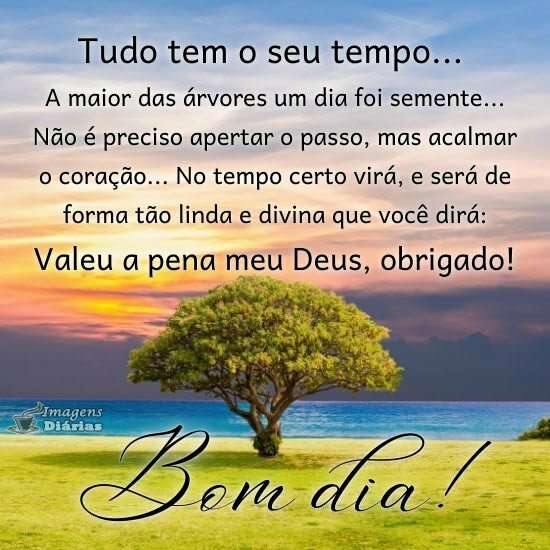 Tudo tem o seu tempo... A maior das árvores um dia foi semente... Não é preciso apertar o passo, mas acalmar o coração... No tempo certo virá, e será de forma tão linda e divina que você dirá:
