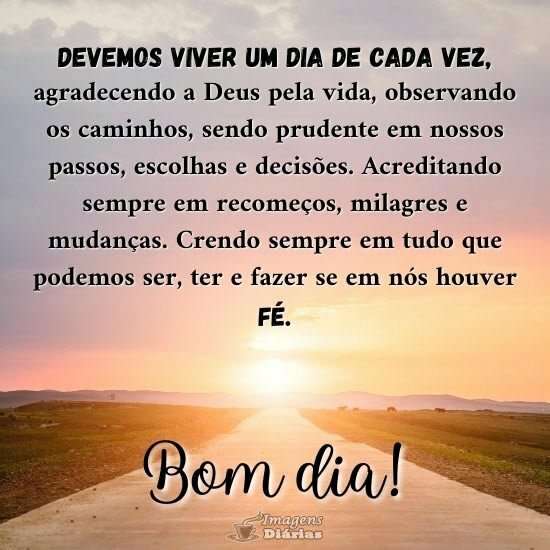 Devemos viver um dia de cada vez, agradecendo a Deus pela vida, observando os caminhos, sendo prudente em nossos passos, escolhas e decisões. Acreditando sempre em recomeços, milagres e mudanças. Crendo sempre em tudo que podemos ser, ter e fazer se em nós houver fé.