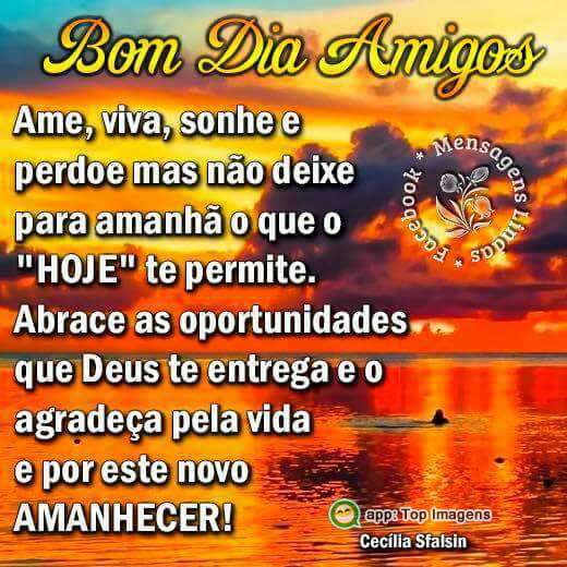 Ame, viva, sonhe e perdoe mas não deixe para amanhã o que o "HOJE" te permite. Abrace as oportunidades que Deus te entrega e o agradeça pela vida e por este novo AMANHECER!