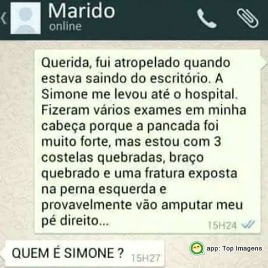 - Querida, fui atropelado quando estava saindo do escritório. A Simone me levou até o hospital.