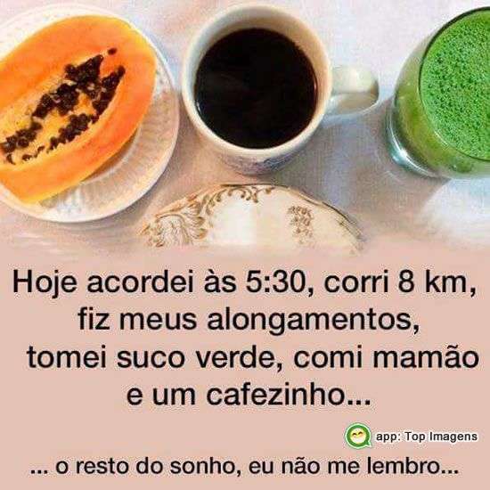 Hoje acordei às 5:30, corri 8 km, fiz meus alongamentos, tomei suco verde, comi mamão e um cafezinho...