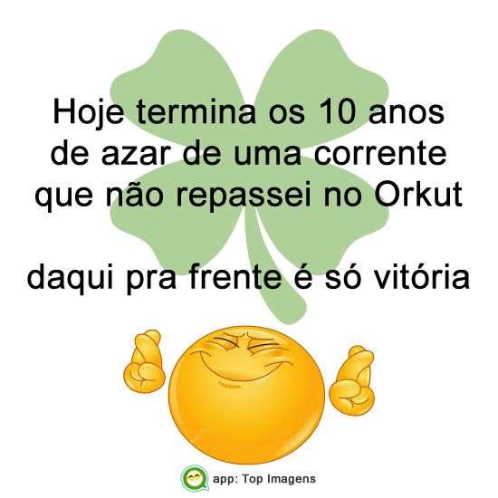Hoje termina os 10 anos de azar de uma corrente que não repassei no orkut daqui pra frente é só vitória