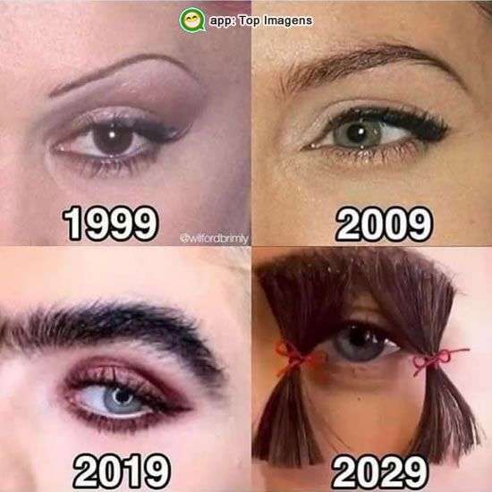 Evolução da sobrancelha nos anos de 1999, 2009, 2019 e 2029.