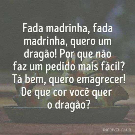 Fada madrinha, fada madrinha, quero um dragão! Por que não faz um pedido mais fácil? Tá bem, quero emagrecer! De que cor você quer o dragão?