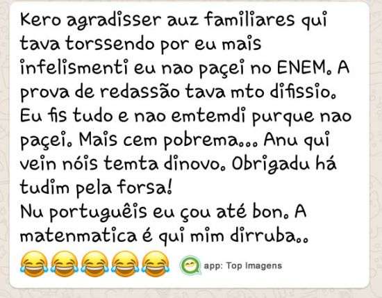 Kero agradisser auz familiares qui tava torssendo por eu mais infelismenti eu não paçei no ENEM. A prova de redassão tava mto difissio.