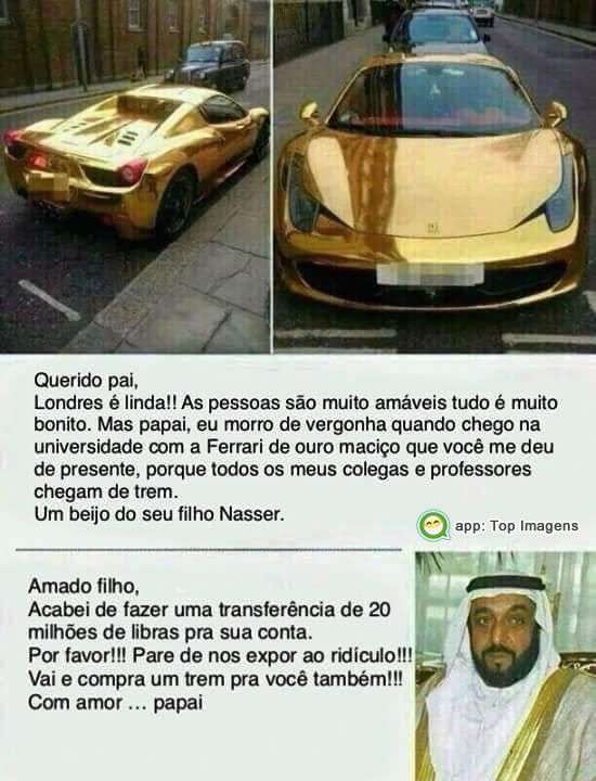 As pessoas são muito amáveis tudo é muito bonito. Mas papai, eu morro de vergonha quando chega na universidade com a Ferrari de ouro maciço que você me deu de presente, porque todos os meus colegas e professores chegam de trem.