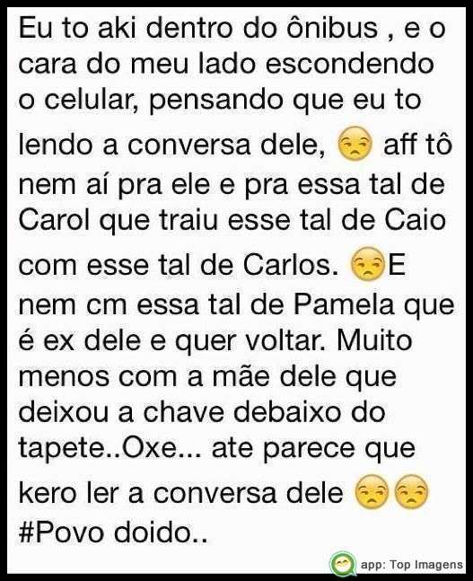 Eu tô aki dentro do ônibus, e o cara do meu lado escondendo o celular, pensando que eu tô lendo a conversa dele, aff tô nem aí pra ele e pra essa tal de Carol que traiu esse tal de Caio com esse tal de Carlos.