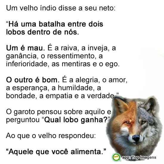 "Há uma batalha entre dois lobos dentro de nós. Um é mau. É a raiva, a inveja, a ganância, o ressentimento, a inferioridade, as mentiras e o ego.