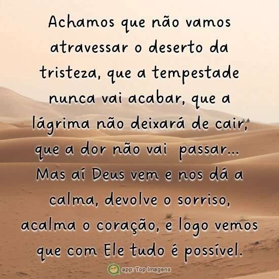 Achamos que não vamos atravessar o deserto da tristeza, que a tempestade nunca vai acabar, que a lágrima não deixará de cair, que a dor não vai passar...