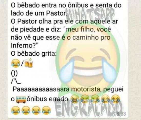 O bêbado entra no ônibus e senta do lado de um Pastor. O Pastor olha pra ele com aquele ar de piedade e diz: "meu filho, você não vê que esse é o caminho pro inferno?"