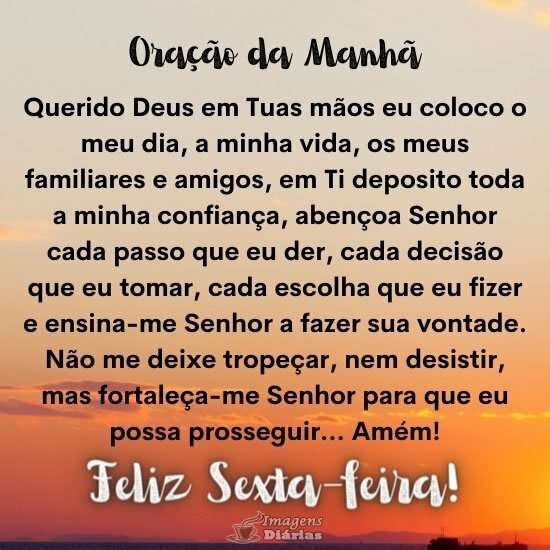 Querido Deus em Tuas mãos eu coloco o meu dia, a minha vida, os meus familiares e amigos, em Ti deposito toda a minha confiança, abençoa Senhor cada passo que eu der, cada decisão que eu tomar, cada escolha que eu fizer e ensina-me Senhor a fazer sua vontade. Não me deixe tropeçar, nem desistir, mas fortaleça-me Senhor para que eu possa prosseguir... Amém!